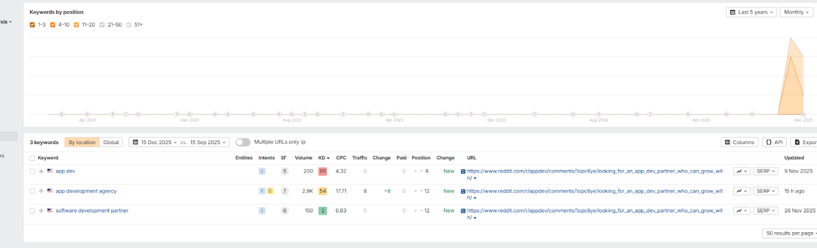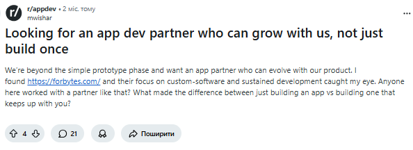 Para atraer clientes potenciales, lanzamos un hilo en r/appdev con una pregunta sobre cómo encontrar un socio para el desarrollo de aplicaciones. El tema se alineó con los puntos de dolor de la audiencia objetivo para generar actividad rápidamente. En cuanto el hilo alcanzó alrededor de 10 comentarios, comenzó a posicionarse en Google.