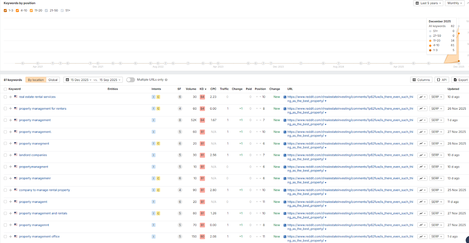 Un solo hilo se posiciona para decenas de variaciones de palabras clave comerciales dentro del nicho de property management. En el TOP aparecieron keywords fuertes como property management (volumen: 52K), real estate rental services, landlord companies.