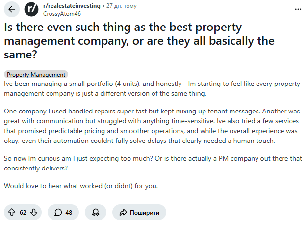 Elegimos el enfoque opuesto: sin menciones de marca al inicio. Creamos y calentamos un hilo en r/realestateinvesting sobre cómo elegir la mejor solución de property management. El contenido se centró no en la empresa, sino en palabras clave comerciales de alto volumen, problemas reales de los inversores y una discusión profunda en los comentarios.